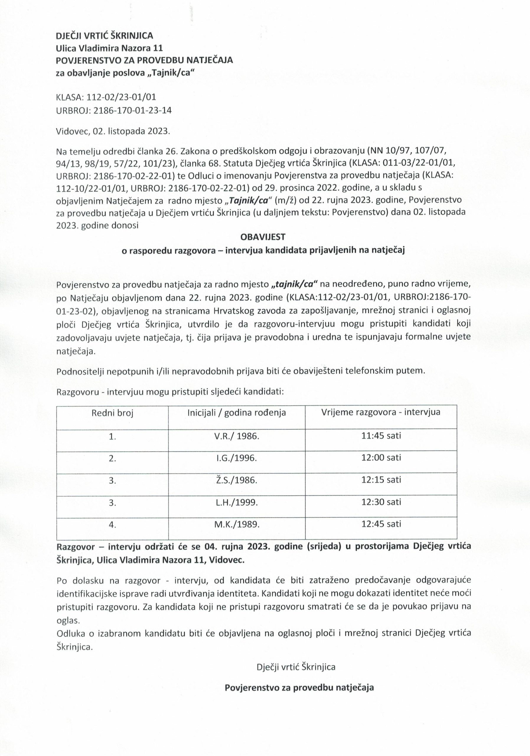 Obavijest o rasporedu razgovora – intervjua za radno mjesto Odgojitelj/Odgojiteljica